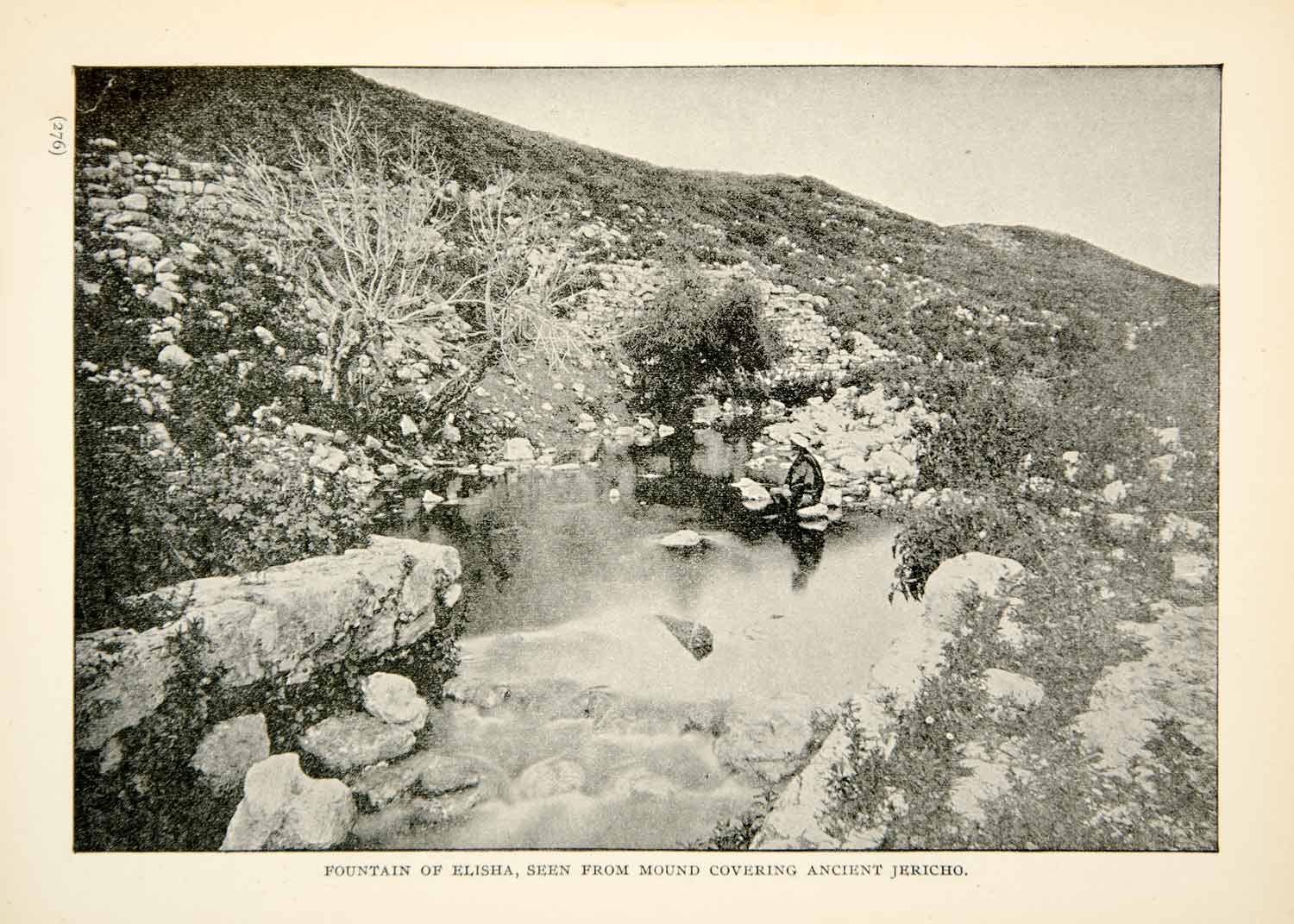 This is an original 1897 black and white halftone print that depicts the Fountain of Elisha, located at the site of ancient Jericho in the Holy Land.