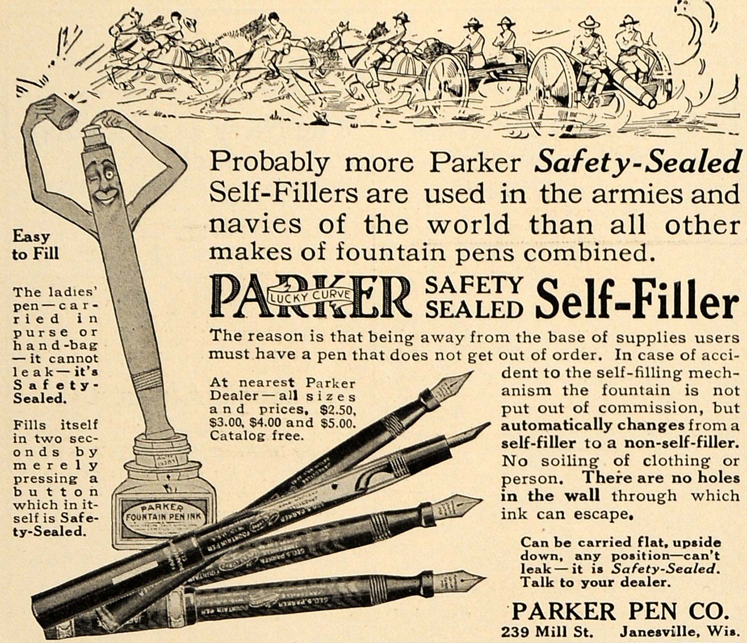 This is an original 1916 black and white print ad for Parker Lucky Curve, Safety Sealed, Self-Filler Fountain Pens by the Parker Pen Company located at 239 Mill Street, Janesville, Wisconsin.