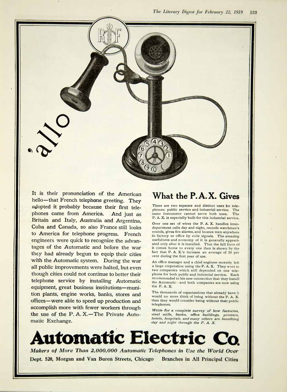 This is an original 1919 black and white print ad for the P.A.X. candlestick telephone that was made and sold by the Automatic Electric Company of 520 Morgan and Van Buren Streets, Chicago, Illinois.