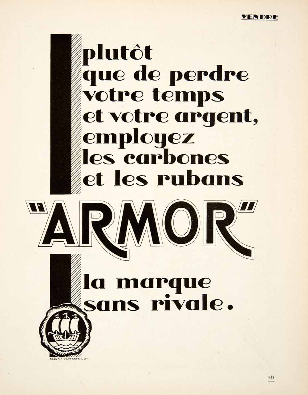 This is an original 1926 black and white print ad for Armor typewriter ribbon and carbon papers by Francis Vareddes & Cie.