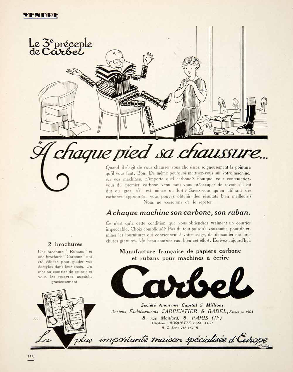 This is an original 1926 black and white print ad for typewriter ribbons and carbon papers produced by the Société Anonyme Carbel (formerly Carpentier & Badel), located at 8 Rue Maillard, Paris.