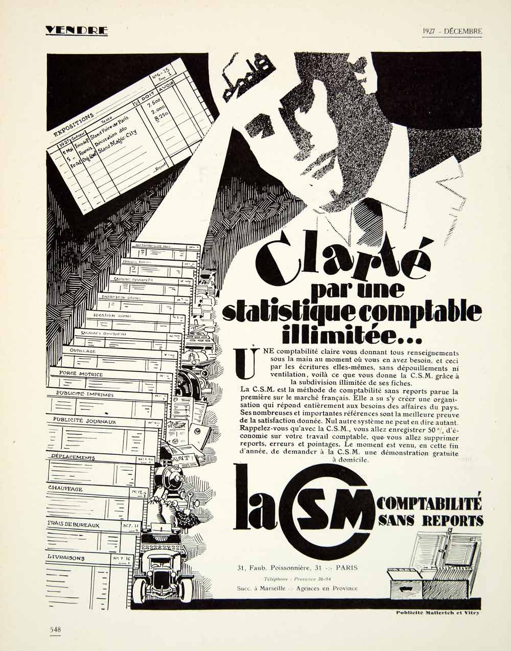 This is an original 1927 black and white print ad for CSM calculation machines. Their offices were located at 31 faubourg Poissonière, Paris.