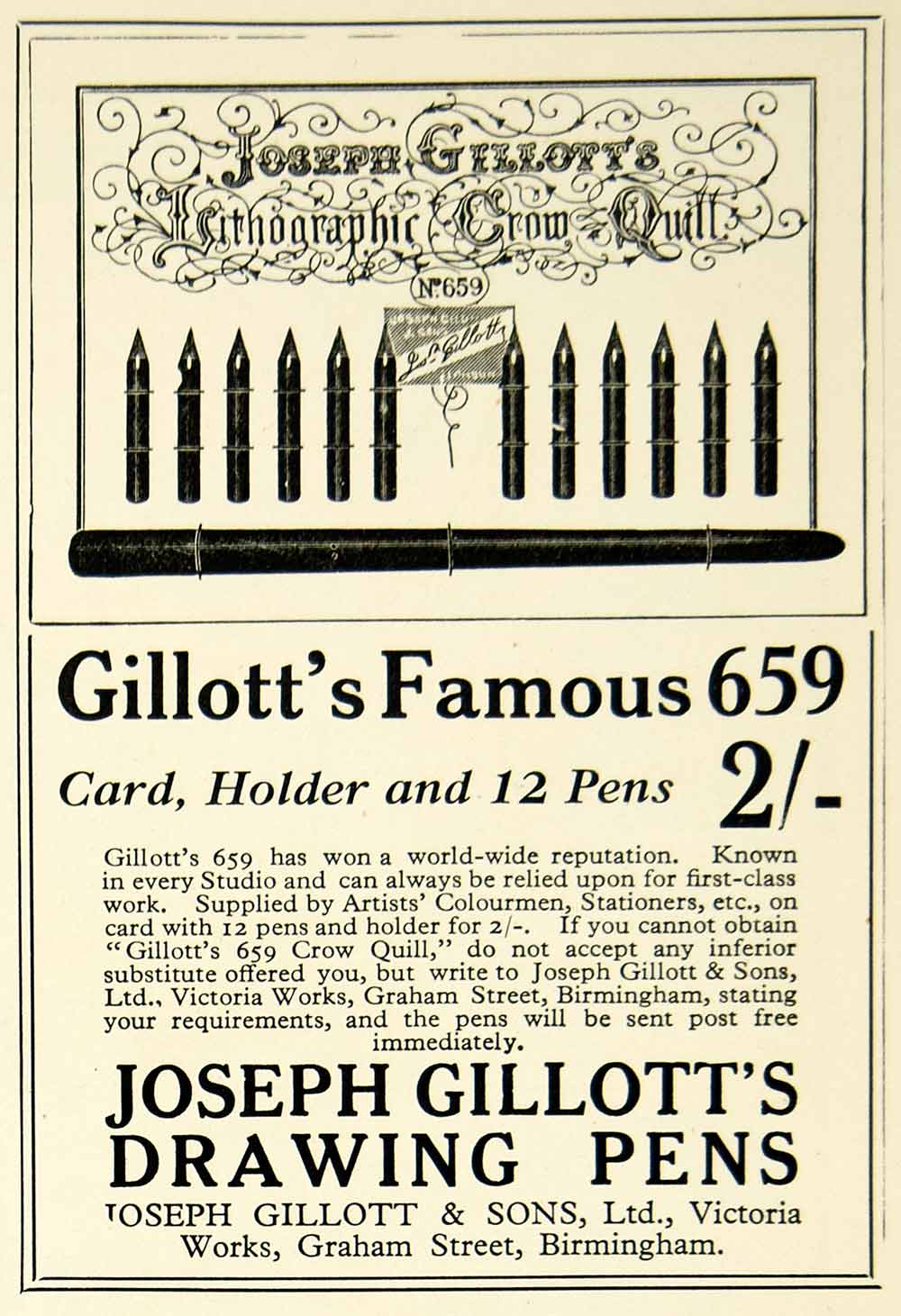 This is an original 1928 black and white print ad for the No. 659 Crow Quill pen that was made and sold by Joseph Gillott & Sons, Ltd. of Victoria Works, Graham Street, Birmingham, England.