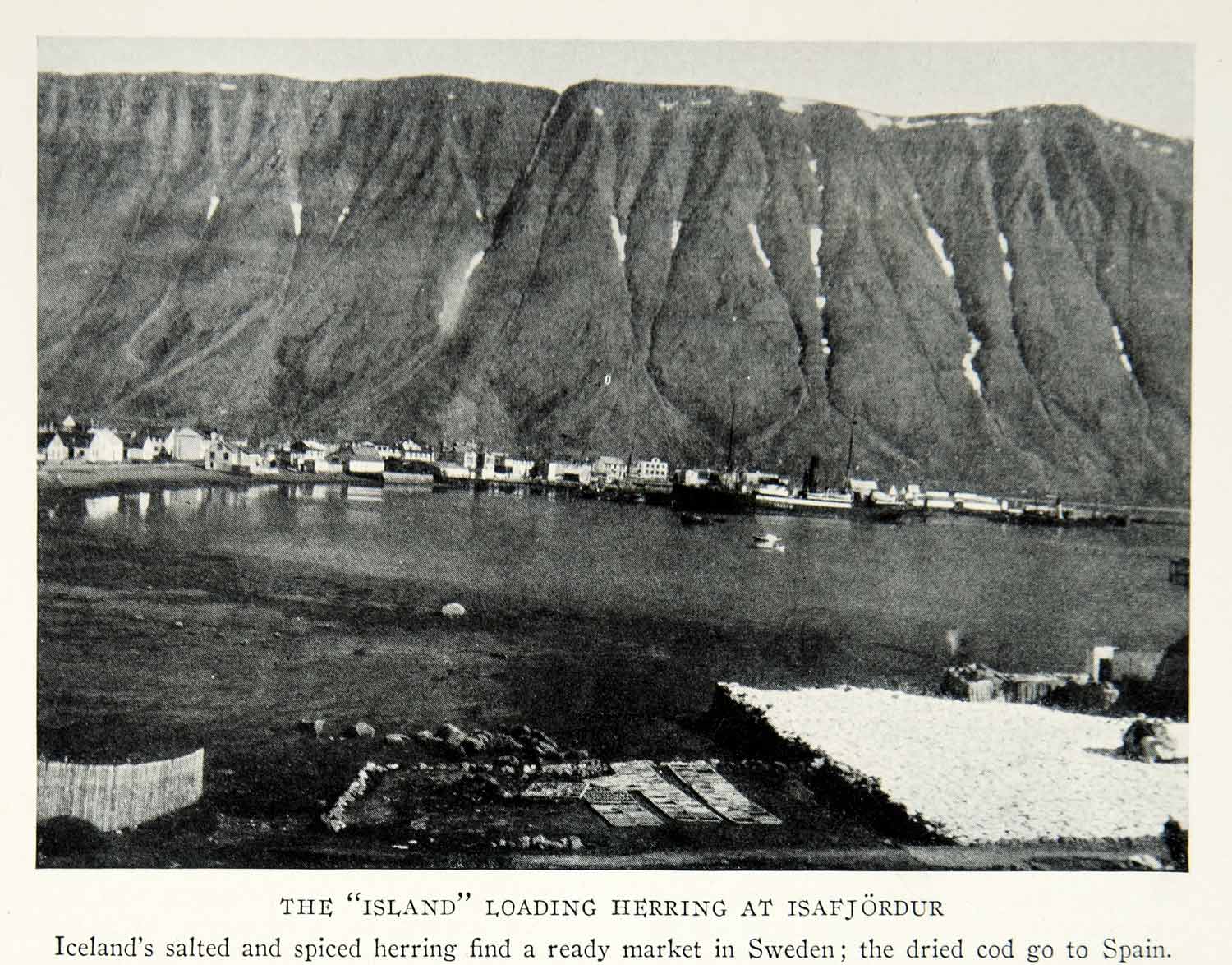 “The “Island” Loading Hering at Isafjördur”This is an original 1928 black and white halftone print of a ship named “The Island” loading herring at the port town of Isafjördur in Iceland.