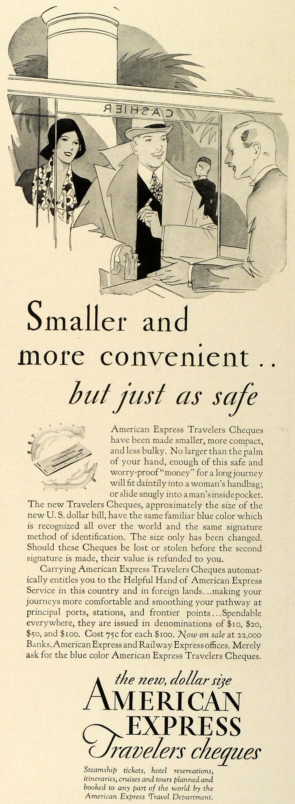 This is an original 1930 black and white print ad for American Express Travelers Cheques.