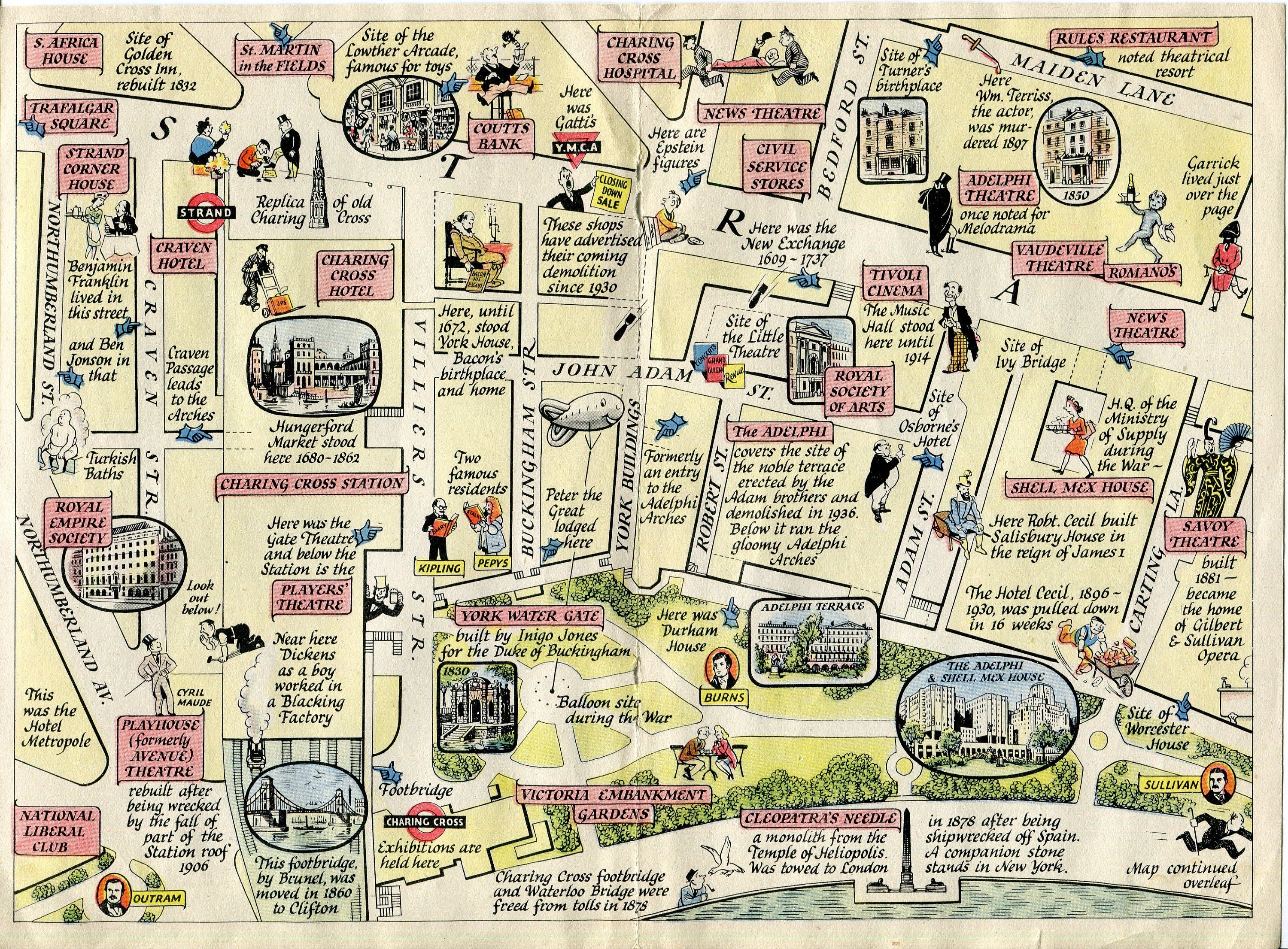 1947 A Map of the Strand, Trafalgar Square to Aldwych, London. A Pictorial Map by J. P. Sayer