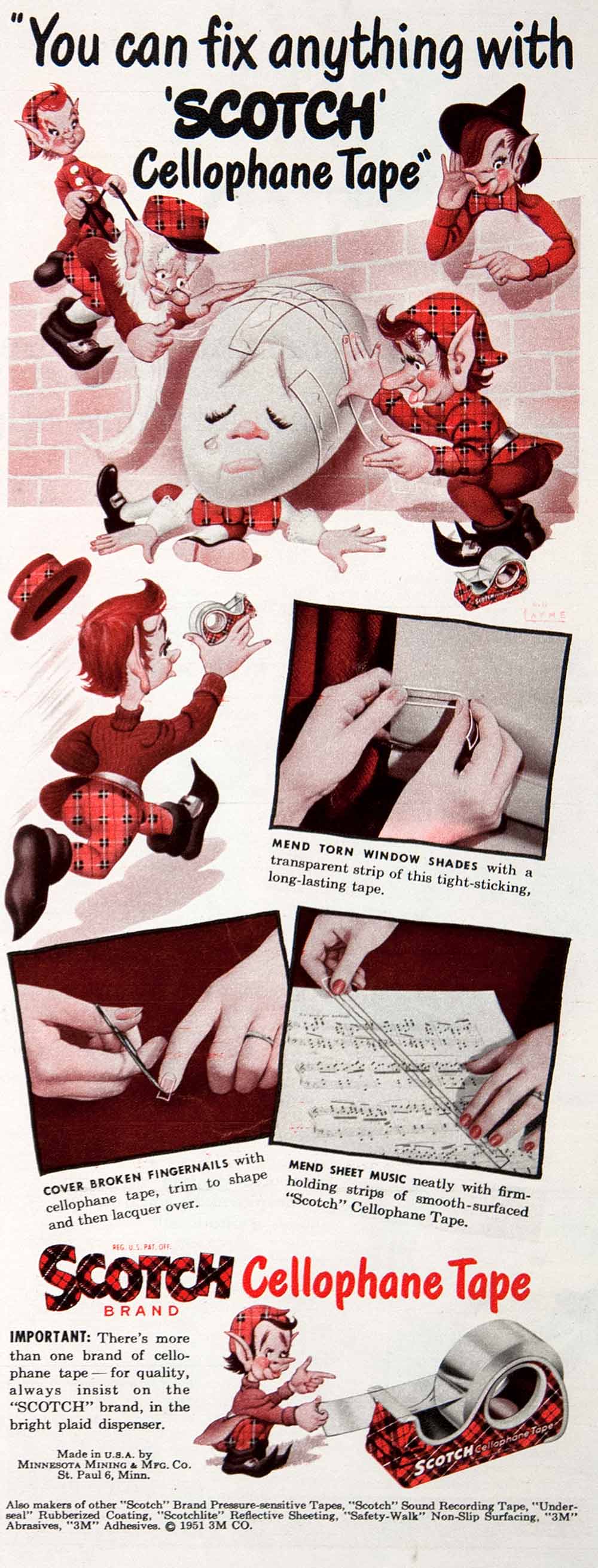 This is an original 1951 color print ad for “Scotch Cellophane Tape,” from the Minnesota Mining & Manufacturing Company, St. Paul 6, Minnesota.