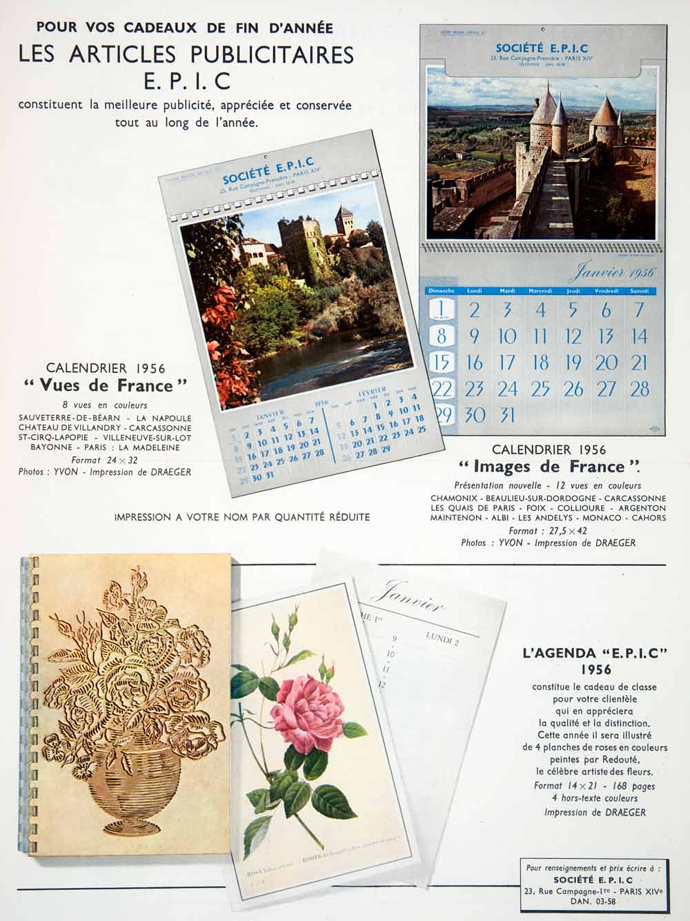 This is an original 1955 two-page color lithograph ad (one double-sided page) for a variety of E.P.I.C. end-of-year corporate gifts such as calendars, day planners, etc.. The Société E.P.I.C. could be reached at 23 rue Campagne-1re, Paris.