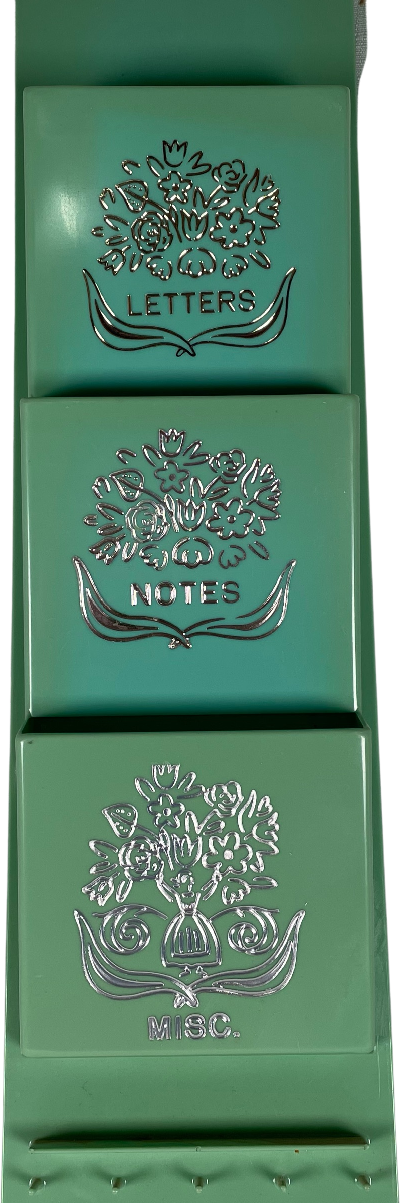 This Vintage Green Mail and Notes Plastic Wall Organizer is the perfect addition to any home that needs some help staying organized. Three slots for paper items and small pegs for keys. Some slight discoloration as seen in photos (more noticeable under bright lighting) Measures 19 inches long. 6.5 inches wide. Pockets are about 5 inches on deep.