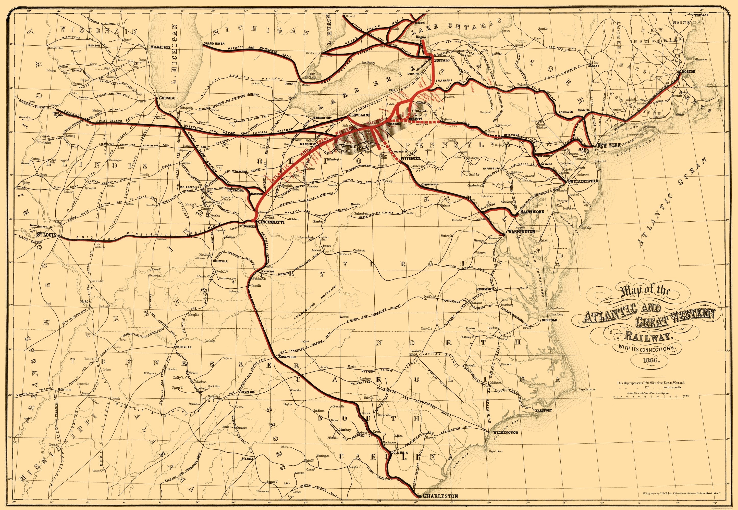 Old Railroad Map – Atlantic and Great Western Railway – Bihan 1866 – This is an exquisite full-color Reproduction printed on high-quality gloss paper, art paper or canvas.